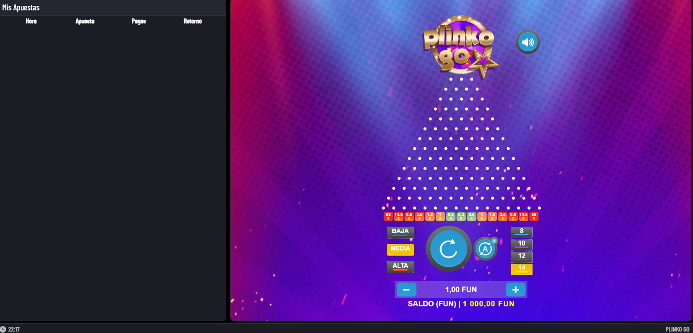 Plinko es un juego inspirado en los clásicos programas de televisión y ferias. La esencia del juego combina suerte y cierta estrategia. Básicamente, lanzas una ficha desde la parte superior del tablero, y esta rebota entre diversas clavijas hasta caer en una de las casillas de premio. Cada casilla tiene un multiplicador que se aplica a tu apuesta, aumentando así la recompensa potencial.